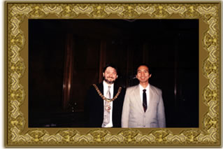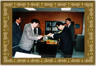 1996年,校领导官福城、王能斌等考察静冈产业大学。图为我校领导与静冈产业集团董事长互赠纪念品